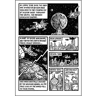 age 3 of 6 of the Comic Christmas Card, "The Invasion". This is the beginning of the comic proper, showing the Invasion of Earth in Cosmic Year 3000, by the dreaded Grinchian Armada.